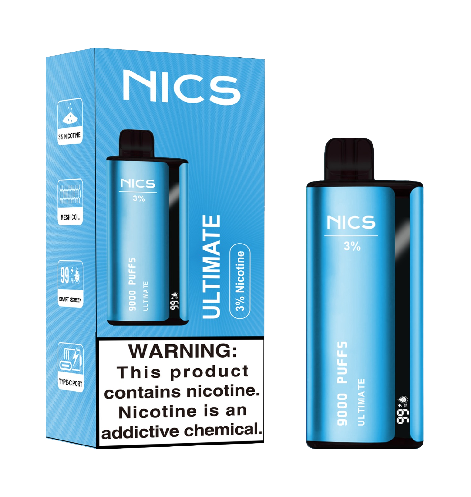 NICS Ultimate 9000 Puffs will bring a brand-new disposable vape flavor to burst your taste buds! The disposable vape adopts a cylindrical design, making it more ergonomic and comfortable to hold NICS in hand. The front airflow adjusting structure at the bottom allows you to adjust the airflow anywhere and anytime when vaping. It is configured with a central AI chip to ensure total vaping safety, including low voltage protection, timeout protection (10 seconds), anti-short circuit protection, and anti-overheating protection. The long-lasting disposable vape has a 650mAh internal battery featuring both E-juice & Battery LED light indicators to ensure you know exactly when to replace and recharge your device. Don’t miss out on this beautiful disposable NICS wholesale.